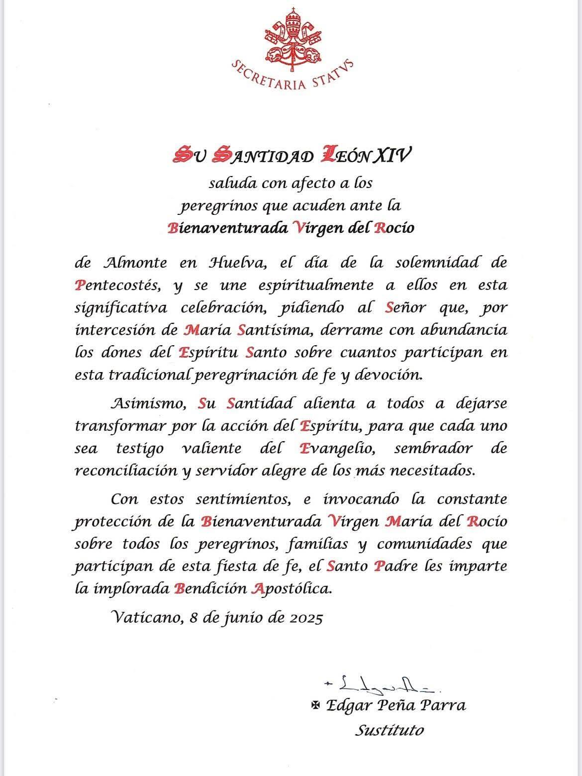 El texto, con fecha de 8 de junio, domingo de Pentecostés, está firmado por Monseñor Edgar Peña Parra, Arzobispo titular de Telepte y Sustituto para los Asuntos Generales en la Secretaria de Estado.
