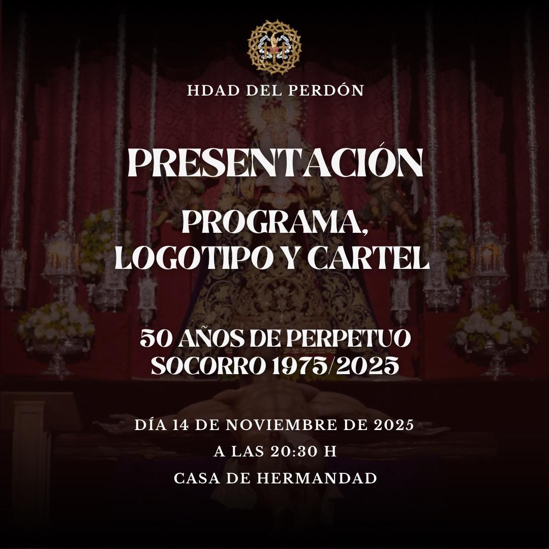La Hermandad del Perdón presentará el proximo viernes día 14 de noviembre, a las 20:30 horas en los salones de su casa de hermandad, los actos conmemorativos de la celebración "50 años de Perpetuo Socorro 1975/2025".