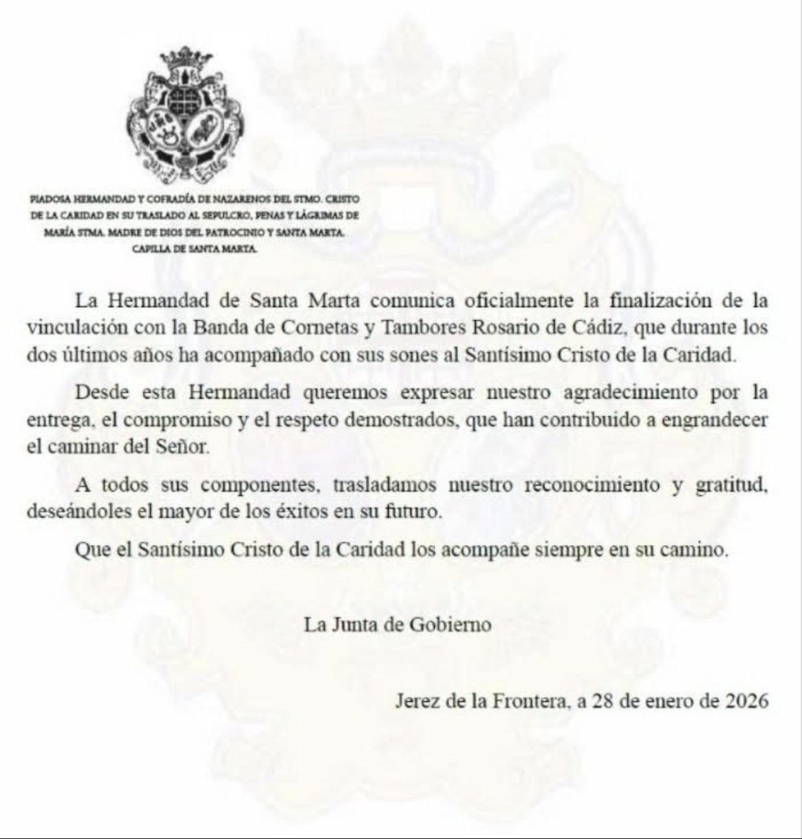 Confirmado: ‘Rosario de Cádiz’ no tocará en Santa Marta