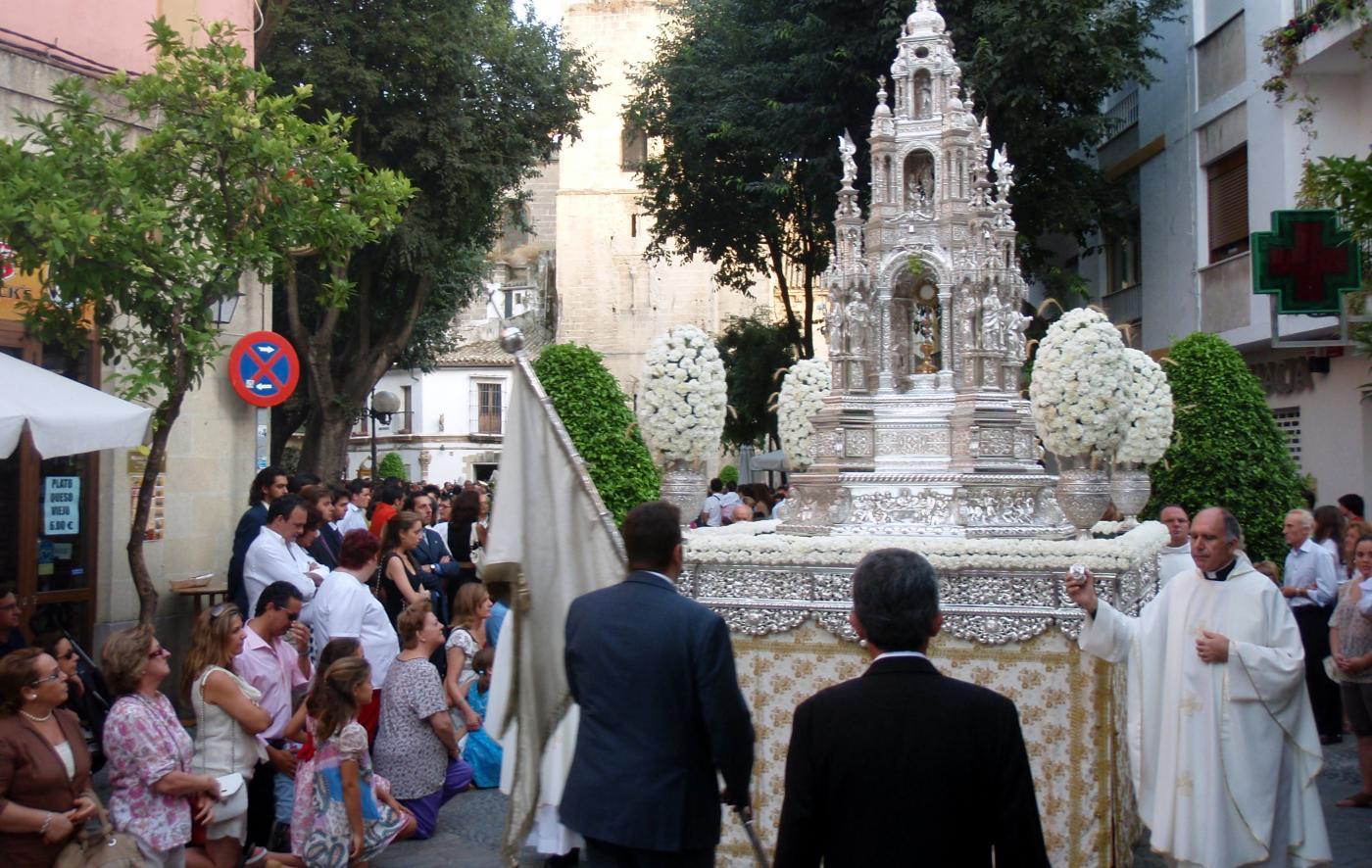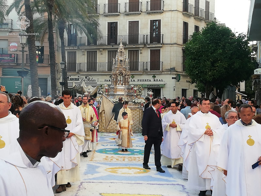 La Solemne Eucaristía estacional dará comienzo a las 18:30 horas en la Santa Iglesia Catedral de Jerez, presidida por el obispo de la Diócesis de Asidonia, monseñor D. José Rico Pavés, comenzando a continuación la procesión de Su Divina Majestad por las calles de la ciudad, a través del siguiente recorrido: Catedral, Reducto, Plaza Encarnación, Hortas Cáliz, Manuel María González, Plaza Monti, Plaza Arenal, Lancería, Larga, Alameda del Banco, Eguilaz, Tornería, Plaza Plateros, Padre Luis Bellido, José Luis Díez, Plaza del Arroyo, Cruces, Reducto y Catedral.
