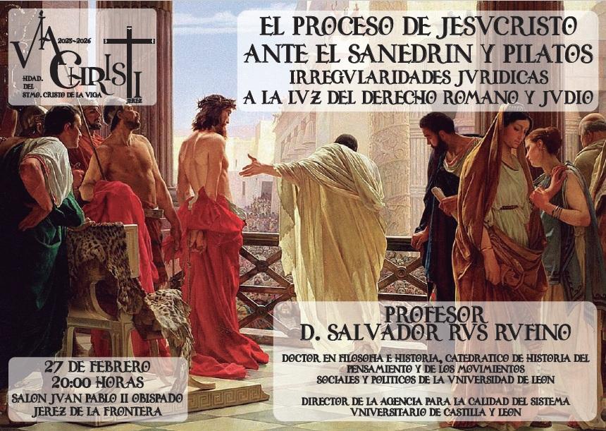 Se trata de una ponencia que tendrá lugar el día 27 de febrero a las 20:00 horas en el salón 'San Juan Pablo II' del Obispado de Jerez, bajo el título "El proceso de Jesucristo ante el Sanedrín y Pilatos. Irregularidades Jurídicas a la luz del Derecho Romano y Judío".