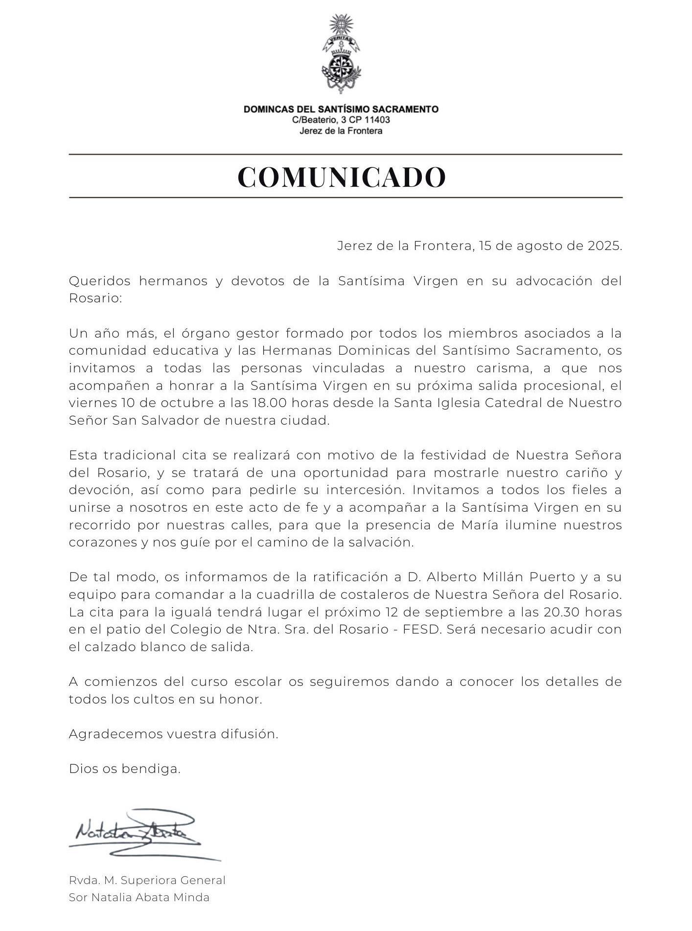 El Beaterio anuncia ya la salida de la Virgen del Rosario