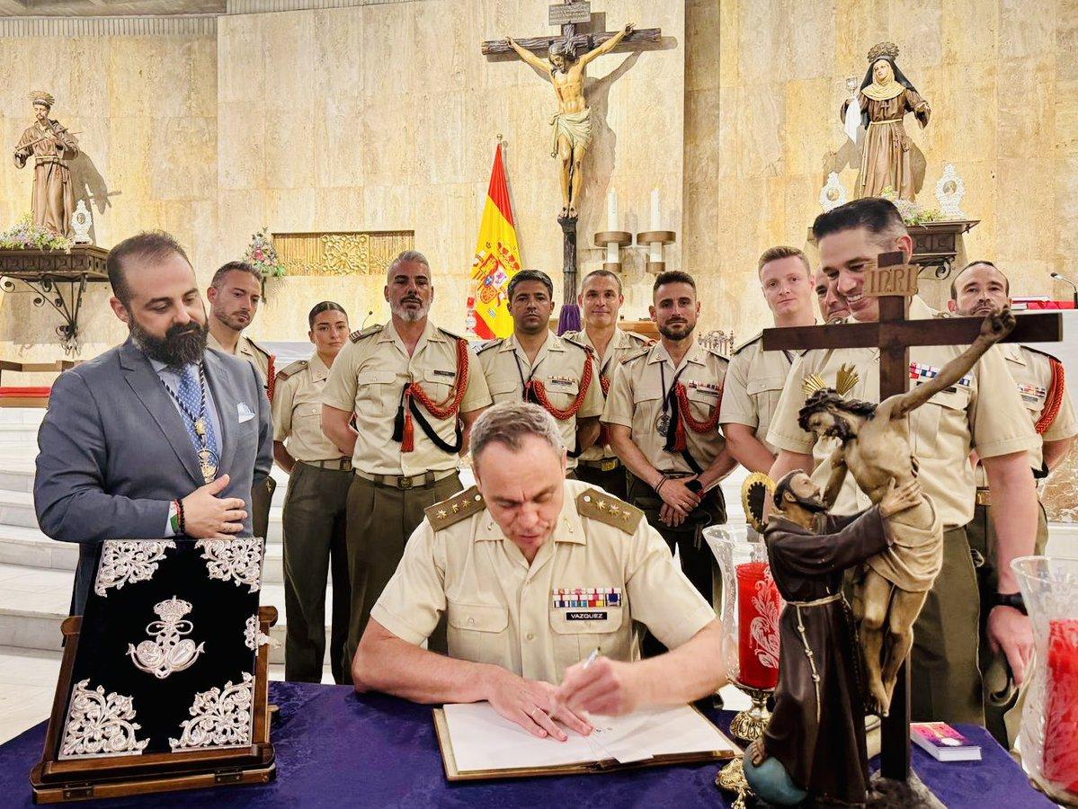 En este acto, ratificando las excelentes relaciones existentes entre la cofradía y el estamento militar, estuvo presente el Coronel del RAAA 74, D. Javier Vázquez, quien firmó en el libro de honor de la hermandad en presencia del hermano mayor y de la escuadra de batidores que lo acompañó al acto.