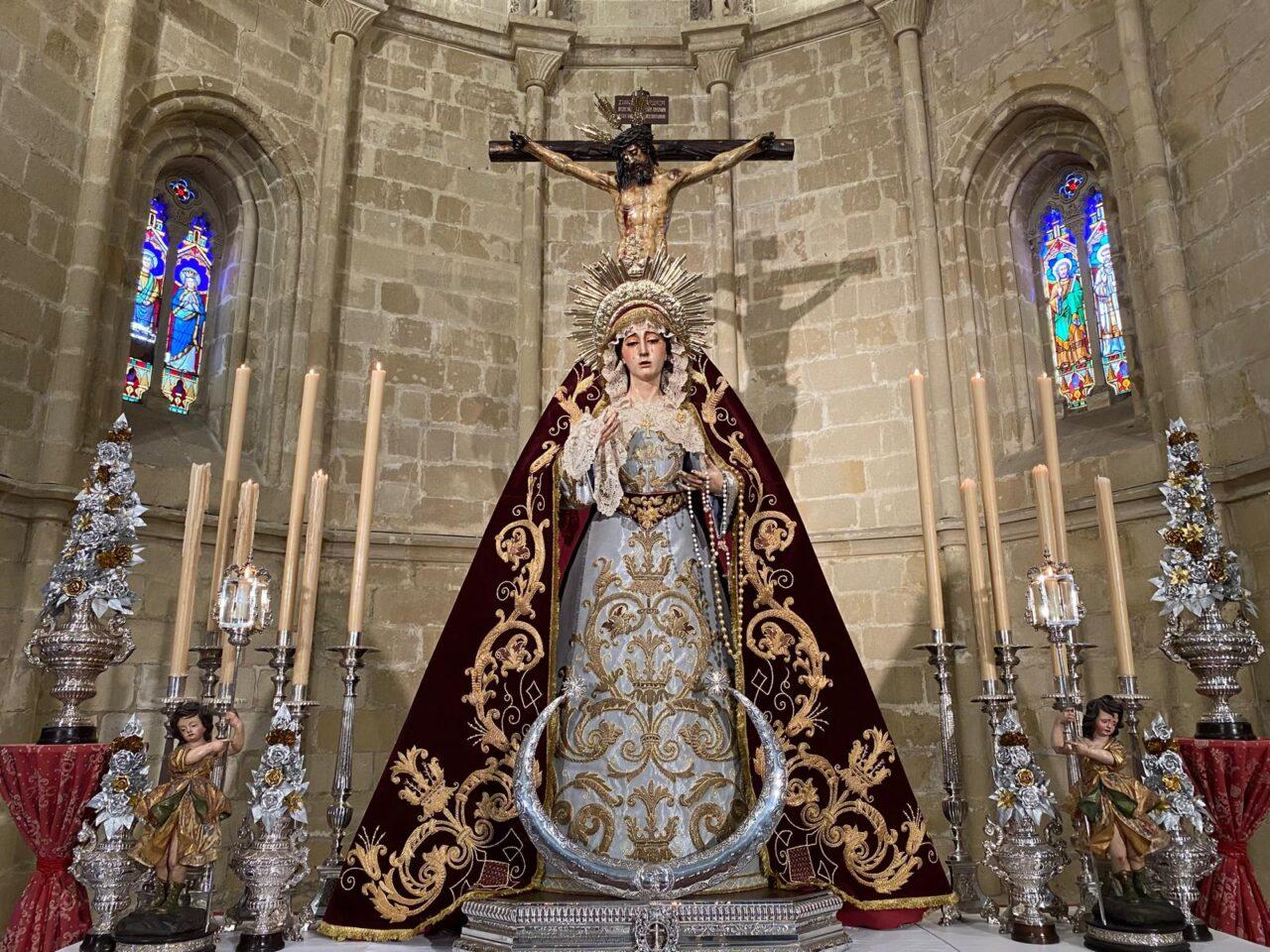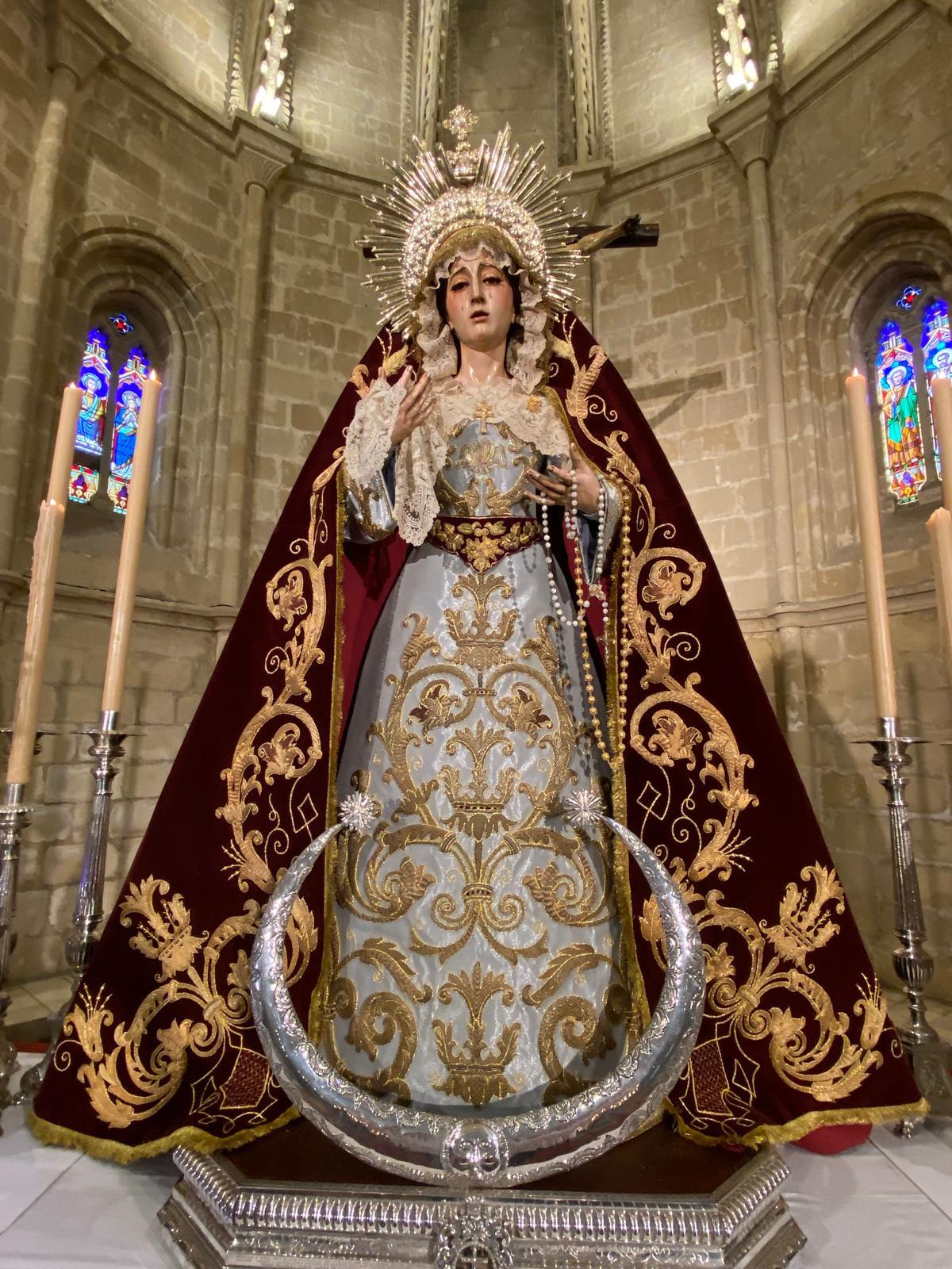 Además, tras el oficio religioso, tuvo lugar la bendición del nuevo manto de vista que estrenaba la imagen de Nuestra Señora de las Lágrimas, realizado por Fernando Calderón con los bordados de la antigua bambalina de la Virgen.