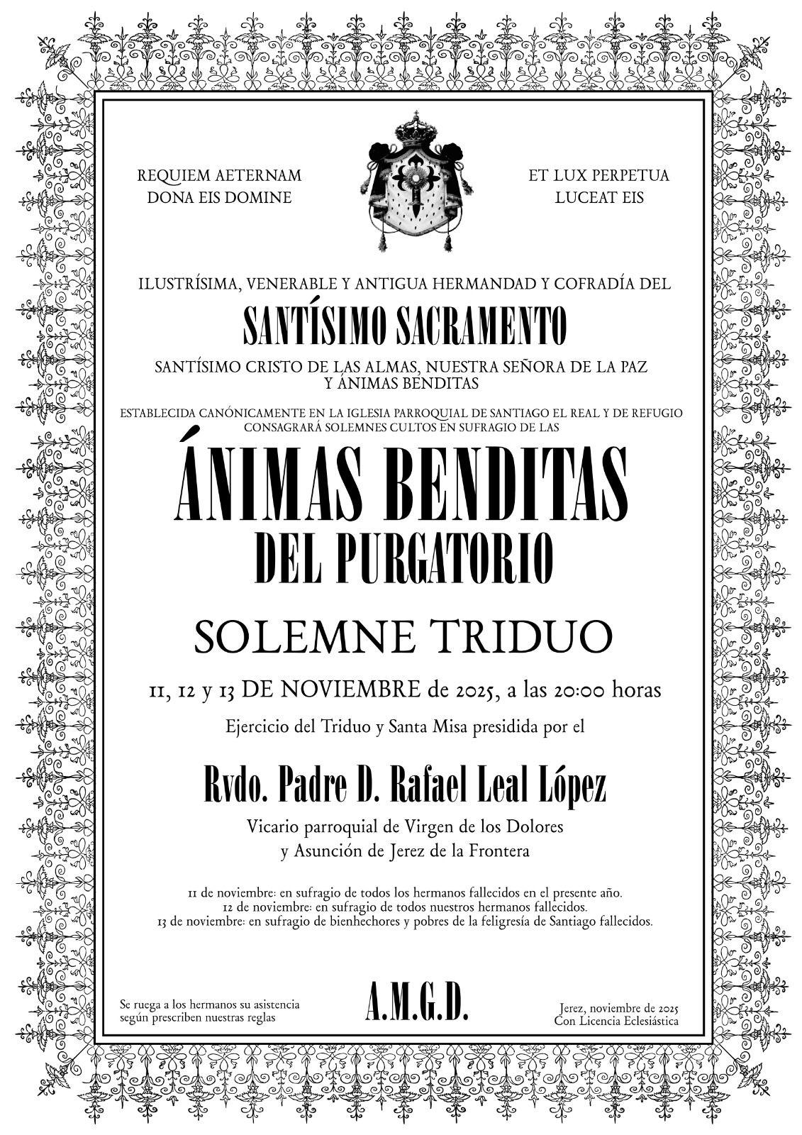 La Hermandad Sacramental de Santiago convoca un año más su actividad cultual del mes de noviembre, en la que consagra solemnes cultos en sufragio de las Ánimas Benditas del Purgatorio.